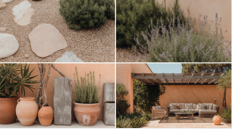 Natural Materials: Stone, gravel, terracotta, and weathered wood create an organic, timeless aesthetic that improves with age.