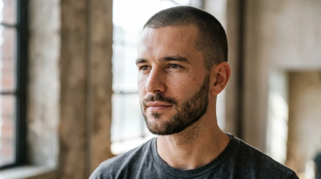 The buzz cut with beard combination is the most stripped-back look on this list, and it’s genuinely powerful. Uniform length on top, sharply defined beard below. That’s the entire formula.