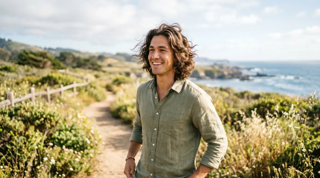 This wavy mens hairstyle is light, youthful, and effortless. The natural wave lifts from the roots and flows around the face with a kind of easy movement that you simply can’t manufacture. The sides are trimmed but not tight, keeping the whole look soft and approachable.
