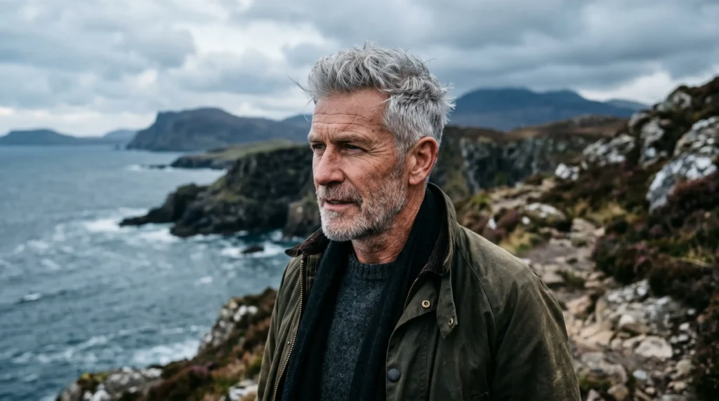 This is one of the boldest mens haircut ideas 2026 on this list, and one of the most impressive. Men are wearing their natural silver and combining it with a sharp, textured crop. The result is this confident, outdoorsy feel that photographs brilliantly in cooler light.