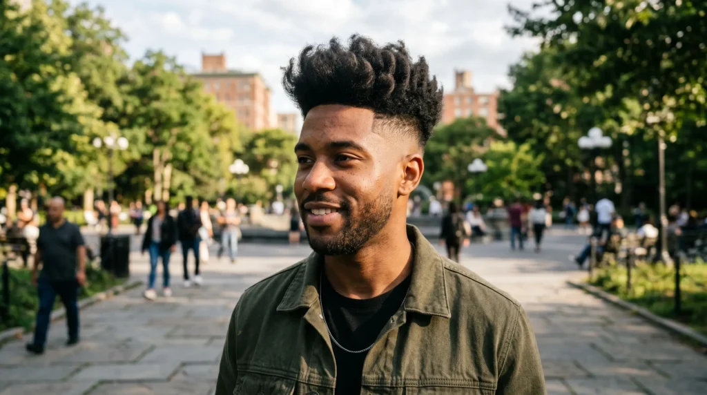 You might be wondering how something this relaxed can still look put together. It’s the fade that does it. Without the clean sides, the textured top would just look messy. With them, it looks like a choice.