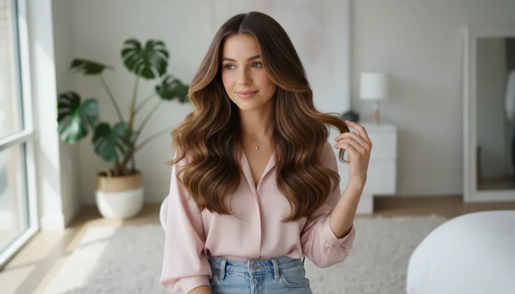 Add some texture with a curling wand—loose bends, not tight curls—and you’ve got a style that works for both casual Fridays and date nights. The movement keeps it from looking too rigid or styled.
