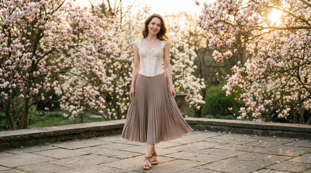 Corset Top + Pleated SkirtEarly dinner into eveningRomantic, airySmart to semi-formal