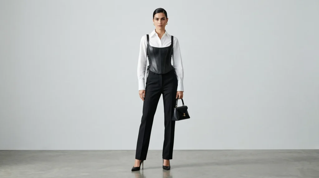 This is the most architectural outfit in this guide — and it’s completely intentional. A white shirt paired with a sculpted black corset and tailored trousers feels graphic and precise. The contrast between white and black does the visual work; the corset is the centerpiece but doesn’t overpower because everything else is so restrained.