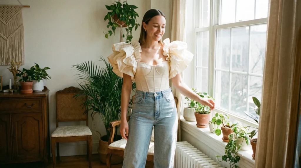 One bold detail is often enough — and this outfit understands that completely. A corset-style top with exaggerated statement sleeves becomes the entire focal point, while relaxed wide-leg denim keeps the overall feel approachable and grounded. It’s playful but controlled — which feels very right for spring 2026 date nights that lean casual but intentional.
