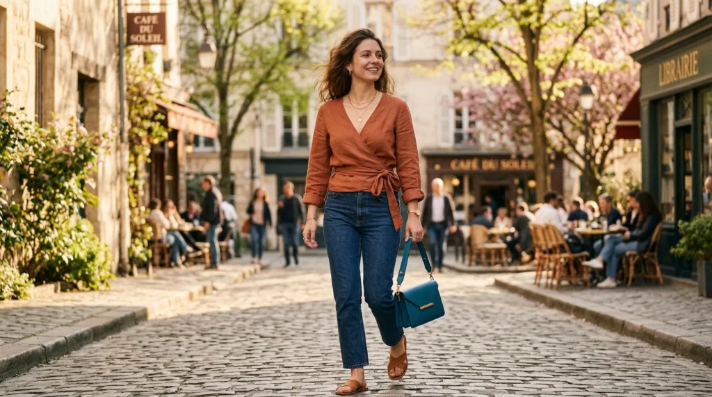 The last look in this guide is the most spontaneous — and sometimes those are the best ones. A wrap-style top in a warm tone with classic straight-leg denim feels relaxed, feminine, and effortlessly modern. It’s minimal, but it’s not stripped of personality. The warmth of the top color does the emotional work.