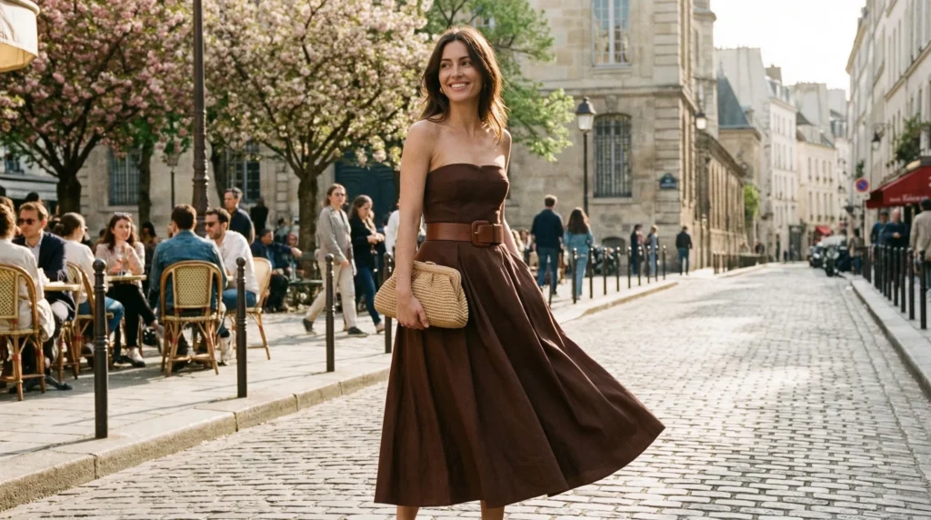Brown has completely shed its serious, corporate reputation — and this chocolate midi dress is proof of it. A structured strapless bodice gives it polish, while the flowing skirt keeps the mood soft and inviting. It’s rich without being heavy, warm without being casual. For a spring 2026 date night, this color hits exactly right.