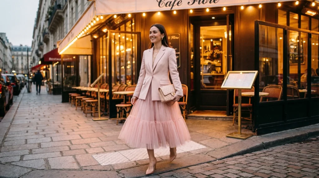 This is the combination that surprises people the most — and wins them over the fastest. A tailored blush blazer over a soft, layered tulle skirt creates a contrast that’s both structured and completely romantic. The blazer brings authority. The skirt brings movement. Together they produce something that’s feminine without being fragile.