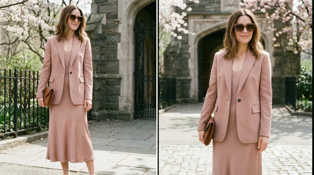 This combination is one of the most reliably elegant moves in minimalist spring dressing. A structured blazer layered over a flowing dress — structured on top, expressive underneath — feels completely current for 2026. The muted blush tones keep it cohesive, and the contrast between the jacket’s sharp lines and the dress’s movement makes the silhouette genuinely interesting.