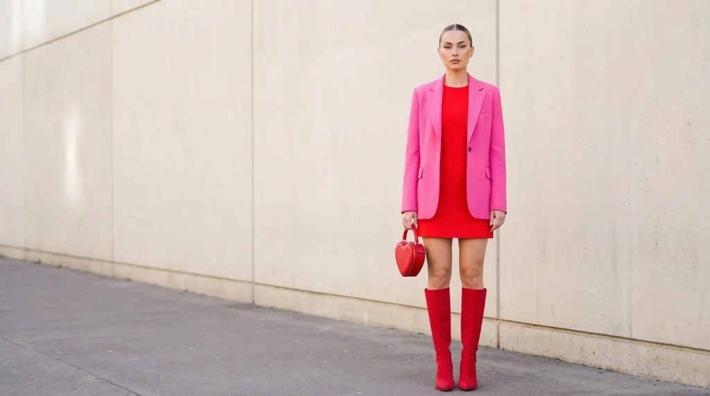Here’s the look that challenges the assumption that minimalism means neutral. A saturated red mini dress under a vivid pink blazer — and it still reads as clean and edited because the silhouette is completely uninterrupted. No extra layers, no competing accessories. The shapes do the restraining; the colors do the talking.