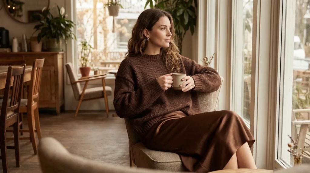 There’s something deeply calming about a head-to-toe brown outfit when it’s done with real intention. An oversized knit sweater paired with a fluid satin skirt in the same tonal family feels quiet, mature, and completely modern. It’s the kind of look that doesn’t rush you — and for a date night built around good conversation, that’s exactly right.