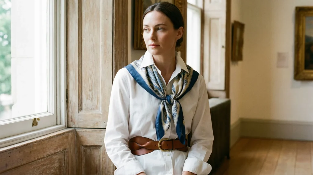 This is a genuinely investment-worthy combination. A good white shirt, a real silk scarf, and a belt with presence — those three things together can carry an entire wardrobe of evenings.