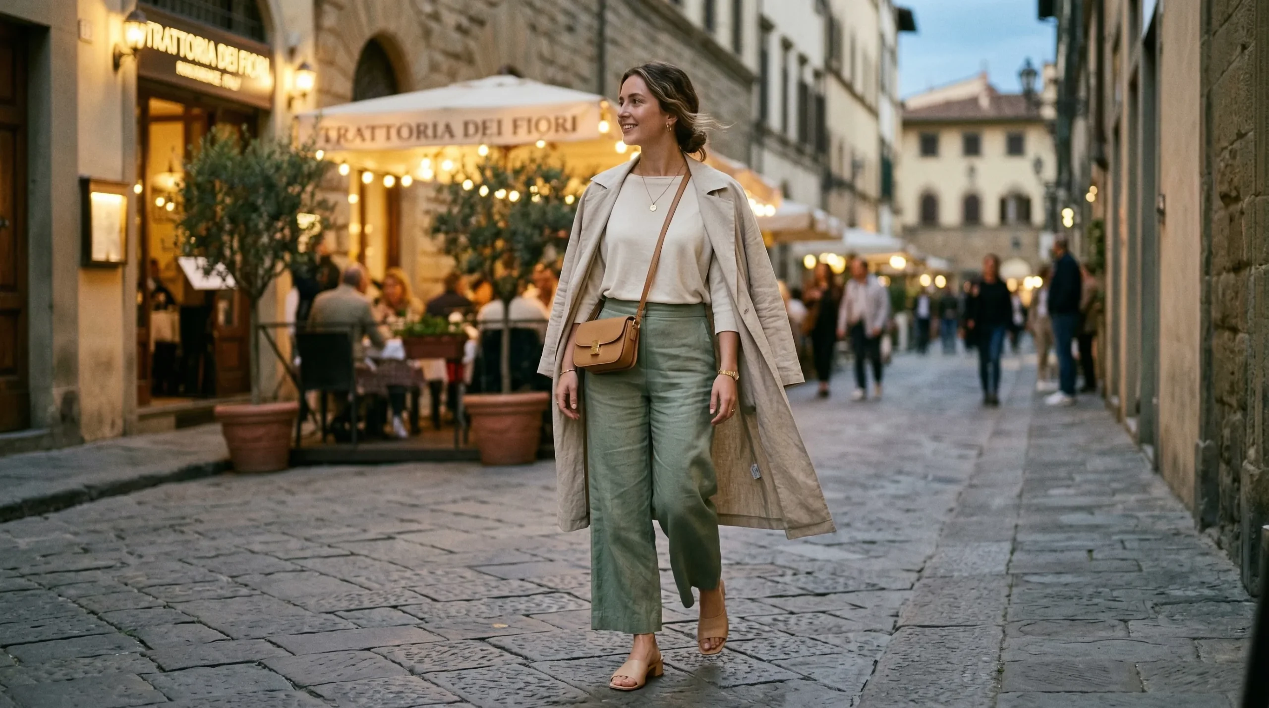 If the evening stretches cooler, a tailored jacket or lightweight knit draped over the shoulders extends this look without changing its character. That kind of adaptability is rare, and it’s worth noting.