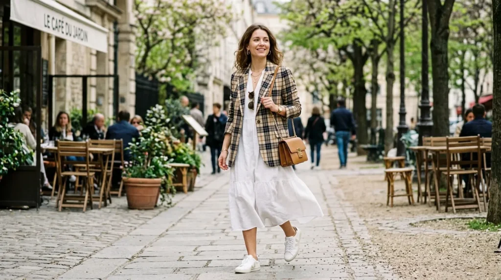 This is the day-into-evening minimalist outfit — the one you put on at three and are still wearing at midnight. A checked blazer layered over a flowing white dress, grounded with clean white sneakers — it’s classic, approachable, and quietly elegant. The blazer adds authority; the dress adds softness; the sneakers say this is a date, not a performance.