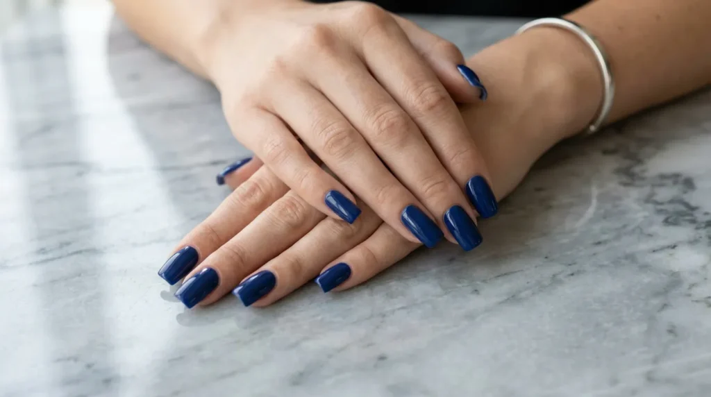 Start simple if you’re new to navy blue nail ideas. A solid glossy manicure on your natural nail length is the perfect entry point. You can always add designs and experiment with shapes later.