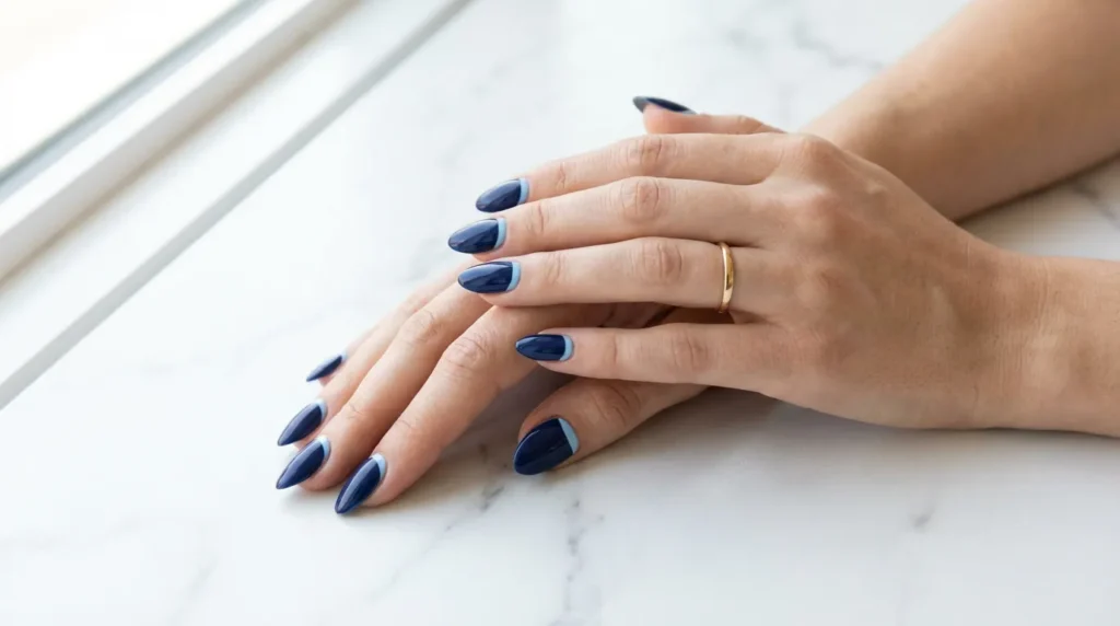 Now here’s where it gets interesting: navy blue acts like a neutral. Sounds crazy, but think about itโ€”it’s basically the dark-wash denim of nail polish. You can pair it with literally anything, and it just works. No overthinking required.