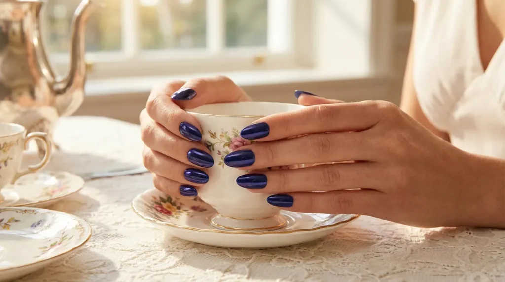 What makes this shade so special is how it plays with different skin tones. I’ve yet to see someone who doesn’t look amazing with navy blue polish. It’s got these deep, inky undertones that photograph beautifully and catch the light in the most gorgeous way.