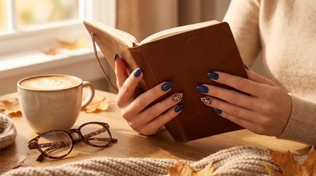You might be wondering if leopard print feels datedโ€”it doesn’t. When paired with navy, it feels fresh and modern rather than early 2000s throwback. The key is keeping the print small and on just one or two accent nails.