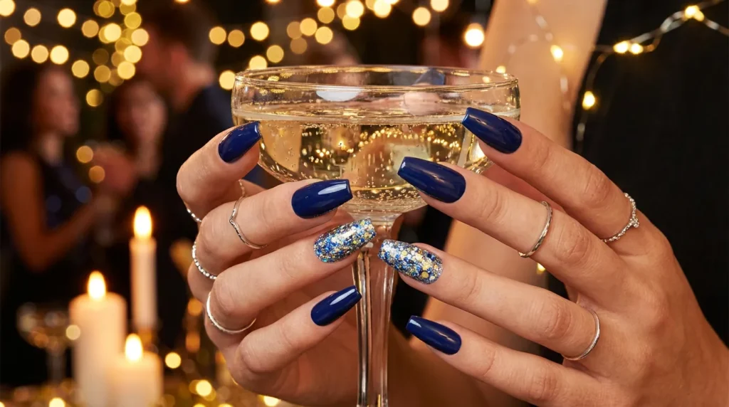 Beginner: Stick with solid navy blue nails or simple accent nails. Use nail tape for clean lines, or try nail stickers for easy designs. Glitter accent nails are also foolproof and look impressive.