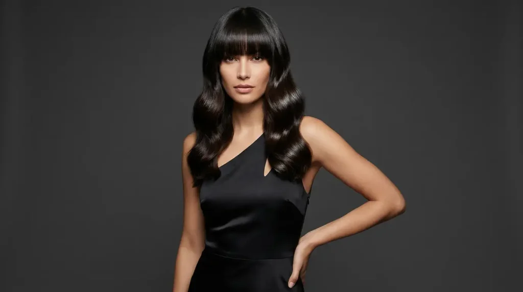 What I love about this style is how clean and polished it looks. The blunt bangs add edge and frame your face, while the smooth ponytail keeps everything sophisticated.