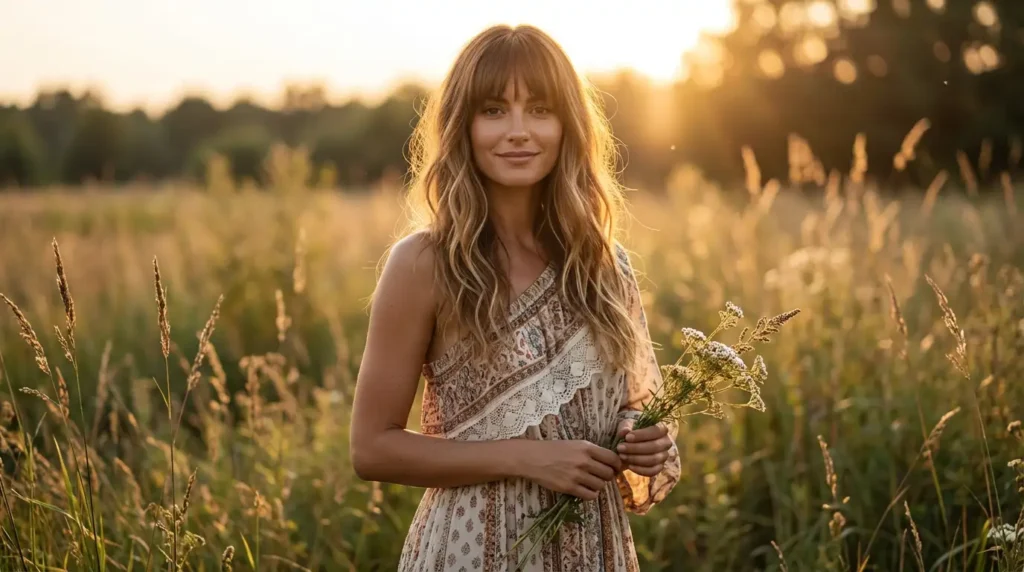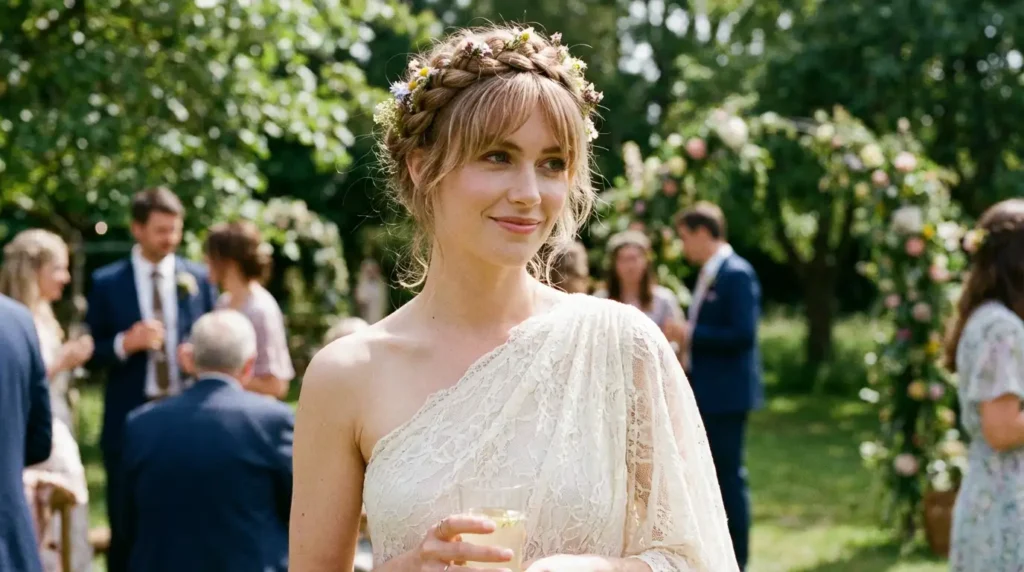 The wispy bangs add youthful energy and frame the face softly. This is perfect for summer weddings or garden parties.