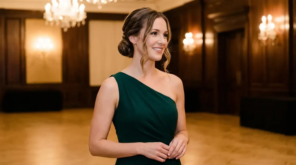 Here’s the thing about one shoulder dress hairstyles—they’re trickier than regular formal hairstyles because you’re working with asymmetry. The dress already has this beautiful, dramatic diagonal line, and your hair needs to complement that without competing with it or making the whole look feel lopsided.