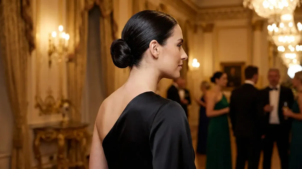 The low chignon is the epitome of timeless elegance. This polished, smooth bun sits at the nape of the neck, creating a sophisticated silhouette that works with virtually any one shoulder dress.