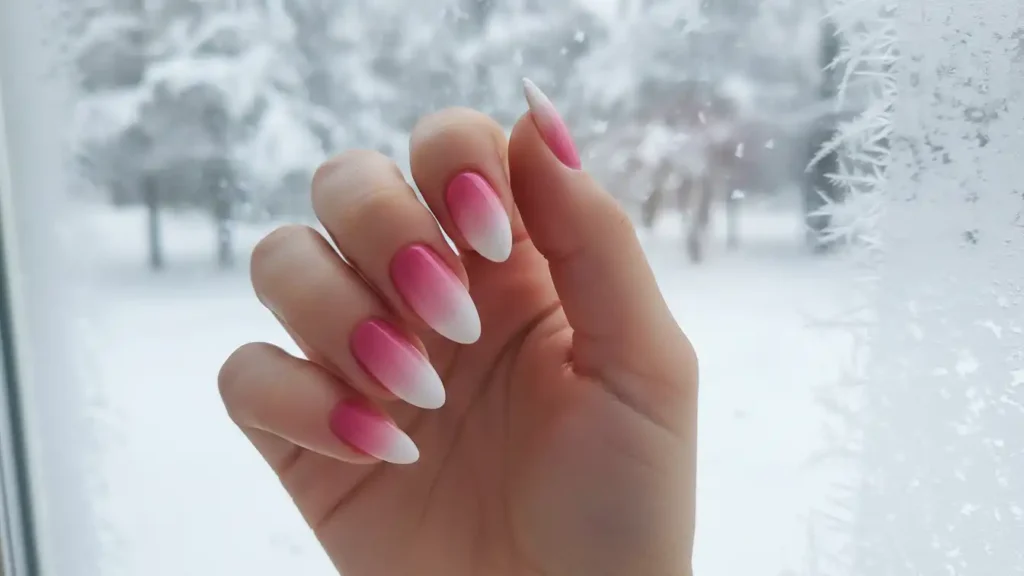 This design gives a frosty, winter feel in the prettiest way. The gradient moves from pink near the cuticle to white at the tips, almost like snow dusting. It looks soft, clean, and very flattering on the hands. Medium to long nails show the ombre best, but it can work on shorter nails too. You can keep it simple or add a tiny snowflake detail on one accent nail. The best part is it grows out nicely because the blend hides the line.