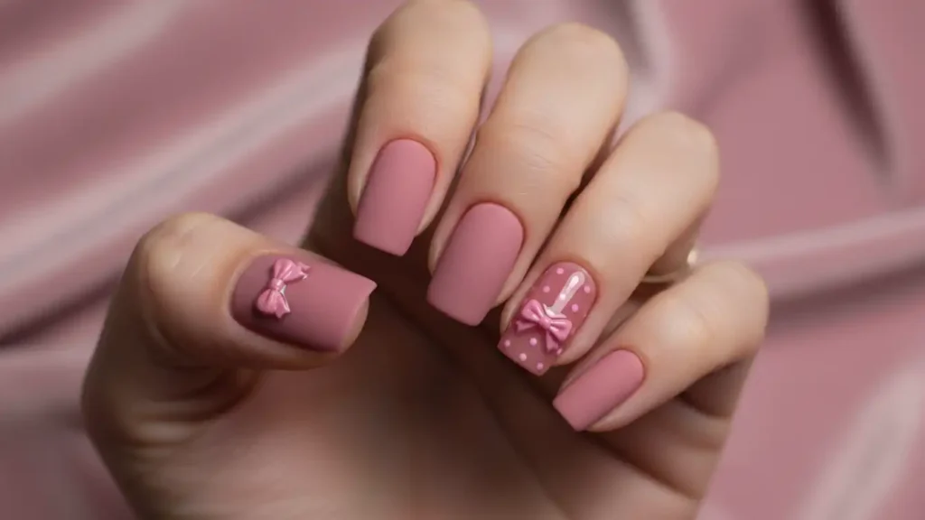 If you want something different but still classy, this is it. Use matte pink on most nails, then add glossy accents like dots, bows, or simple shapes. The matte-vs-shine contrast looks really modern and “Pinterest-worthy.” It feels festive because it looks intentional and styled, even without holiday symbols. Just don’t apply regular top coat on matte nails or you’ll lose that velvety finish. This is perfect for someone who wants holiday nails without the typical glitter overload.