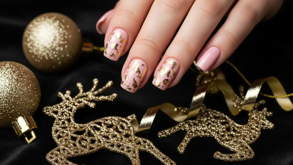 Gold foil flakes on pink nails give that luxury gift-wrap vibe. The foil shines differently than glitter, so it looks more metallic and expensive. You can scatter a few flakes for a subtle look or add more for a bold party manicure. The random placement makes it look custom, even if it’s easy to do. Press foil onto tacky polish or nail glue, then seal with a strong top coat. Pink + gold is a holiday classic, so it fits the season perfectly.