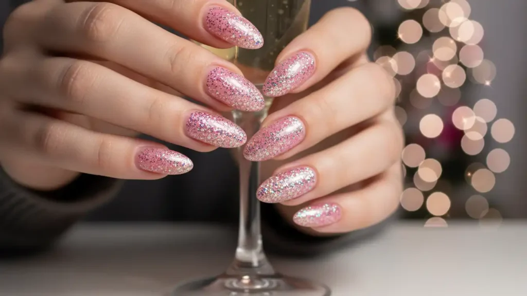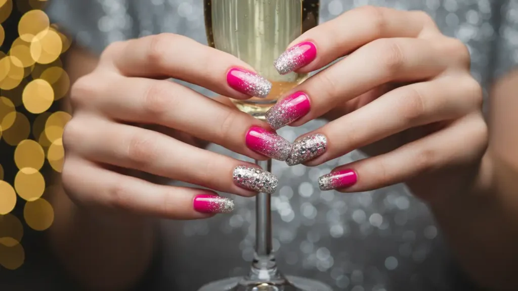If you want bold and sparkly, this one is such a vibe. Start with hot pink near the base and fade into chunky gold or silver glitter toward the tips. The gradient makes it look stylish instead of just “all glitter everywhere.” It’s perfect for parties where you want your nails to stand out, especially New Year’s. Hot pink also flatters most skin tones and instantly brightens your hands. Just seal it well with a thick top coat so the glitter stays smooth and doesn’t snag.