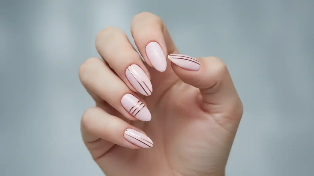 This is clean, elegant, and perfect if you like minimal designs with a holiday touch. Use pale pink as the base, then add thin rose gold stripes for a sleek finish. You can do vertical lines, diagonal accents, or a simple stripe near the cuticle. Rose gold adds warmth and looks gorgeous with winter outfits and gold jewelry. It’s subtle enough for work but still special for holiday dinners. Striping tape makes this much easier if you don’t want to freehand it.