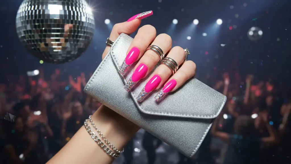 This is a bold, festive twist on a French tip. Paint the nails hot pink, then add silver glitter just on the tips for sparkle. The silver reflects light like crazy, so your nails really stand out at parties. It looks especially stunning on longer nails, but it works on short nails too. You can keep the glitter tips thin and classy or make them thicker for more drama. A strong top coat is a must so the glitter stays smooth and doesn’t snag.