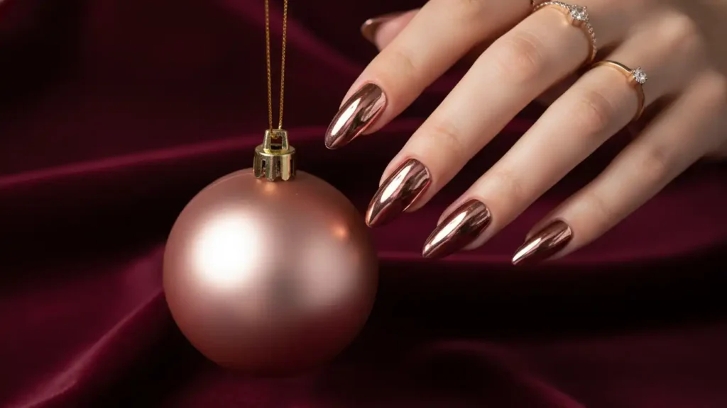Rose gold chrome nails look modern, sleek, and very holiday-ready. The mirror-like finish catches the light in the prettiest way, so your hands always look “done.” The shade sits between pink and gold, so it matches almost any outfit and jewelry. It’s a great option if you want something festive but still neutral and classy. Chrome usually looks best when applied professionally, but the final result is totally worth it. You can keep all nails chrome or mix in a matte rose pink accent for contrast.