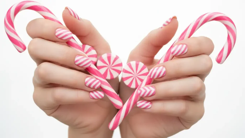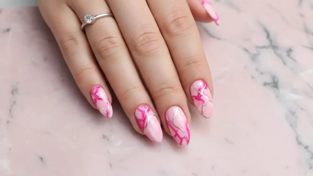 This one looks super high-end because every nail turns out a little different. You swirl a few pink shades together, then add thin silver “veins” to mimic marble. The silver gives it that festive, wintery shine without going full glitter. You can keep it soft with baby pink + white, or make it bolder with a touch of hot pink. It photographs amazingly because the pattern has so much depth. If you don’t want to DIY it, a salon can nail this look perfectly.