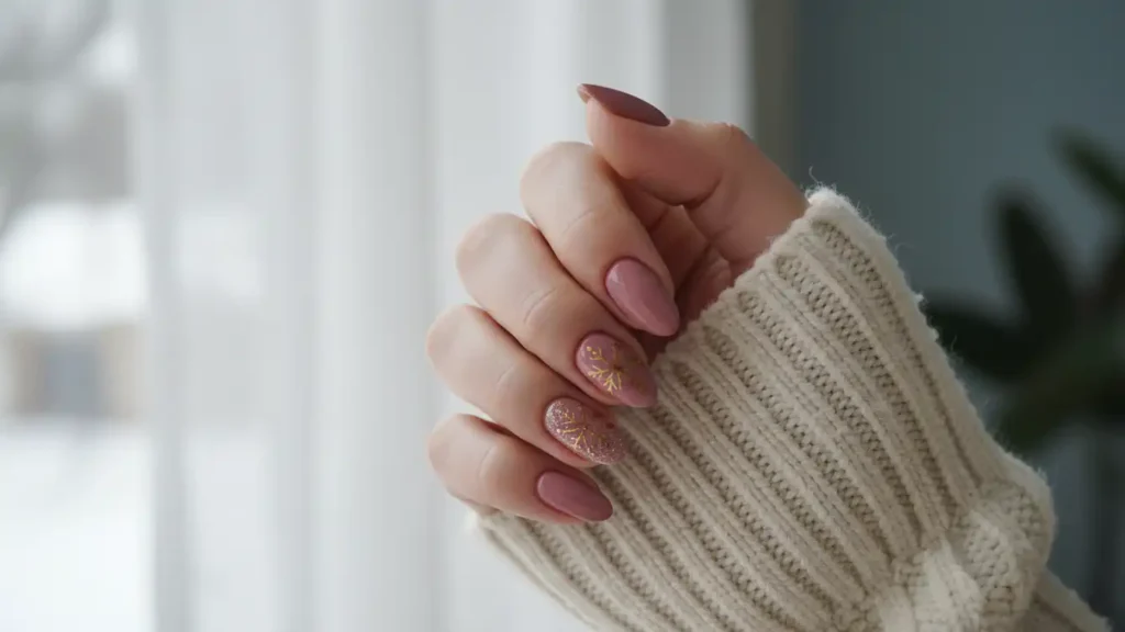 This one is perfect if you want festive nails that feel grown-up. Start with a dusty rose or mauve base, then add small gold snowflakes on one or two accent nails. It gives a holiday feel, but in a subtle “quiet luxury” way. The muted pink is super flattering and doesn’t clash with winter outfits. You can hand-paint the snowflakes if you’re good at nail art, or use stickers to keep it easy. The rose + gold combo looks expensive and photographs really well.