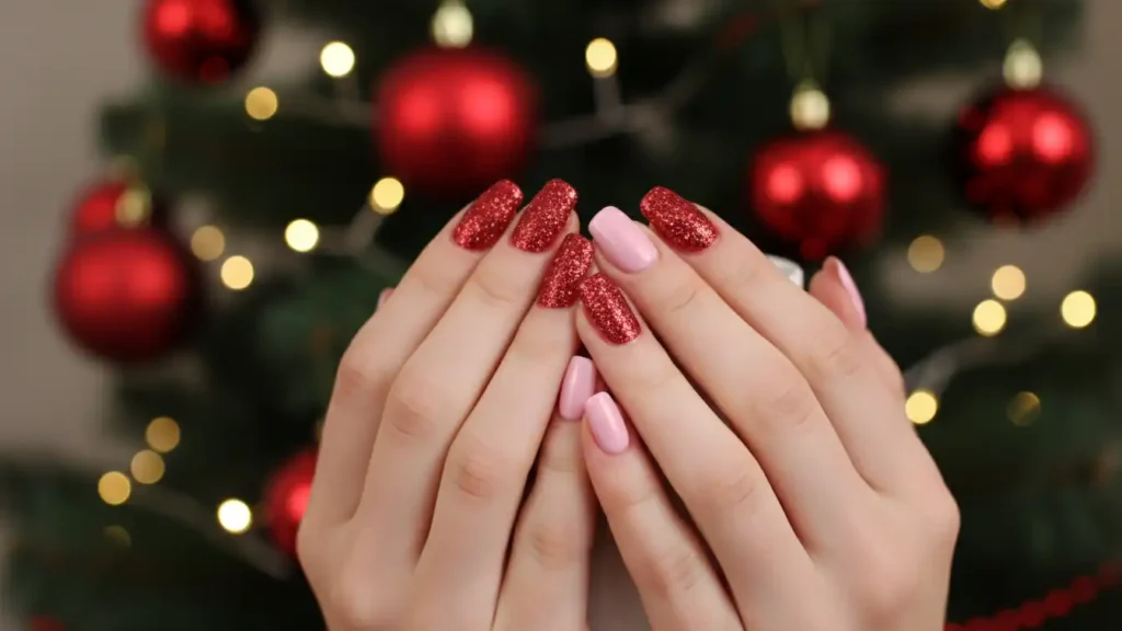 This is the perfect mix of “pink girl” and classic Christmas vibes. Paint most nails soft pink, then add red glitter on one or two accent nails. If you want it more subtle, do red glitter just on the tips instead of full coverage. The pink keeps everything feminine, and the red glitter adds that festive pop. It’s a great choice if you want holiday nails without going full red-and-green. Under party lights, the glitter looks extra stunning.