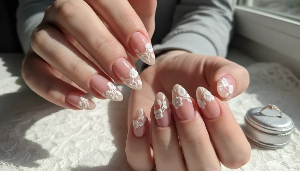 Sheer pink bases keep things light and natural, while raised white florals add texture and a subtle statement you notice up close.