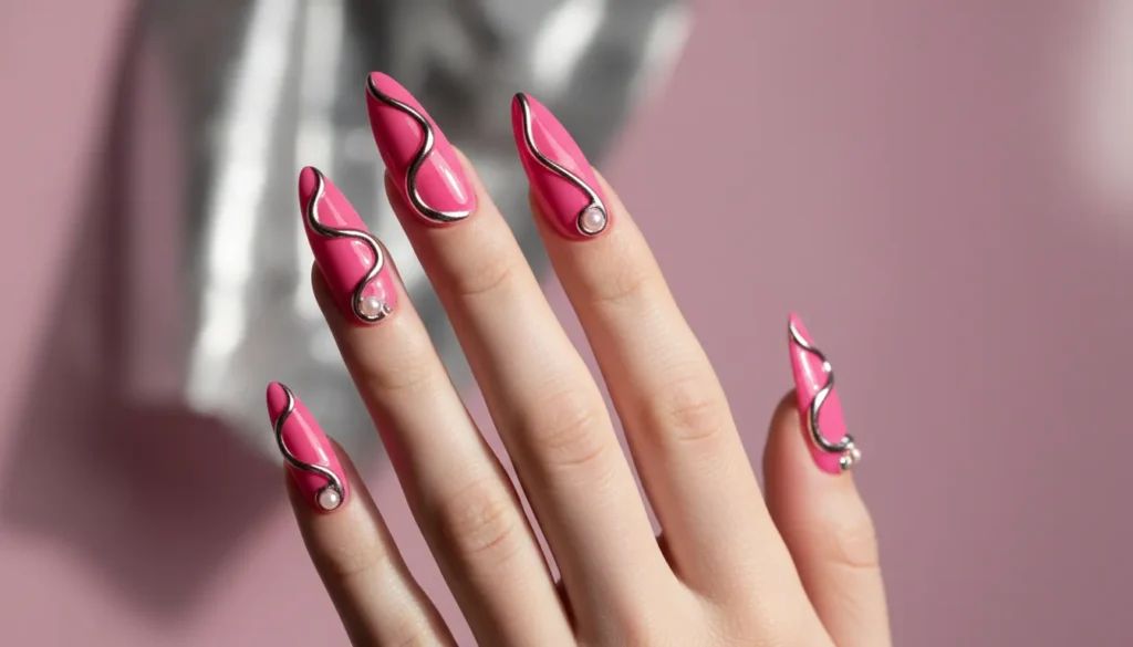 Hot pink nails get a graphic edge with flowing chrome lines that curve across each nail, creating movement and visual interest.