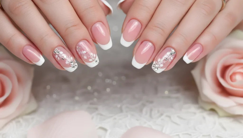 Sheer pink with white French tips is already classic, but adding crystals and delicate floral accents takes it to another level.