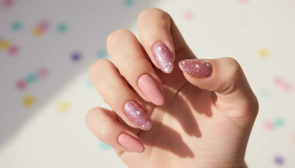 Glitter: Maximum sparkle and drama. Glitter accents on pink nail designs add fun and celebration, though they’re harder to remove.