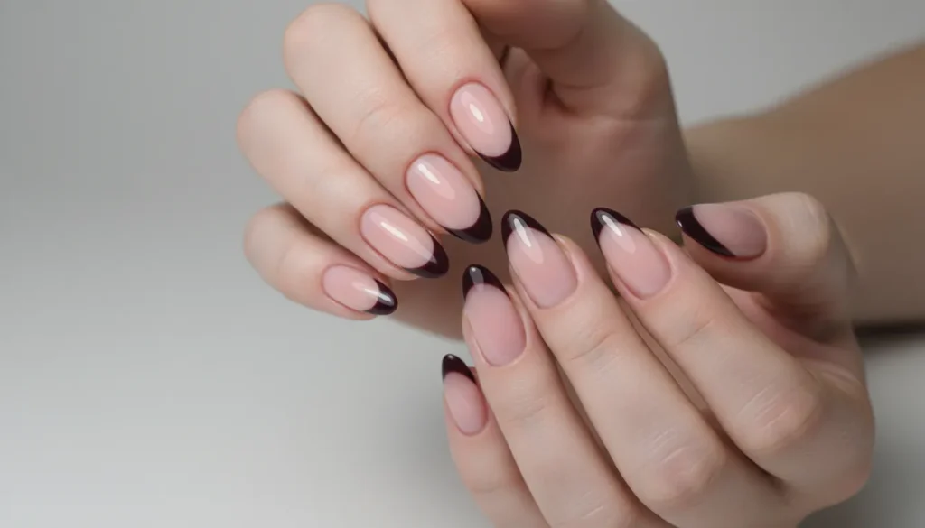 A sheer pink nail base looks clean and polished, while the dark French tip adds unexpected contrast that feels modern and edgy.