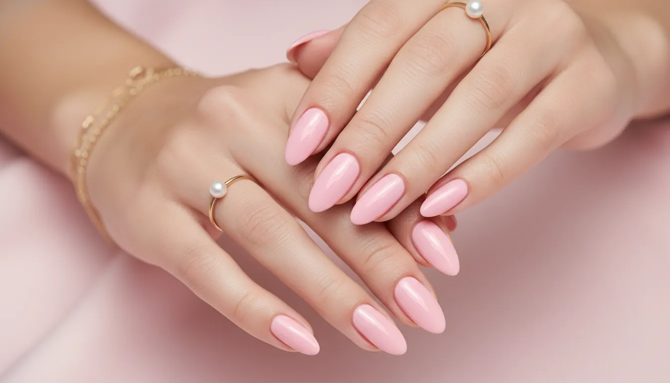A soft pearly pink nail finish adds a glossy, almost glowing quality that’s absolutely gorgeous in natural light.