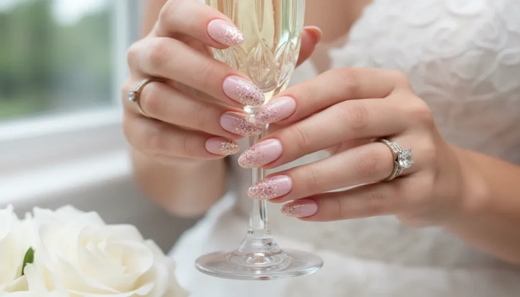 Soft pink glitter nails give off this sweet, almost beachy-but-still-bridal vibe that feels really fresh. The glitter adds sparkle without being overwhelming.