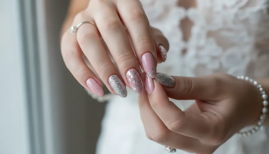 There’s something effortlessly pretty about mixing blush pink with tiny silver accents and one glittery statement nail. It feels bridal without being loud.