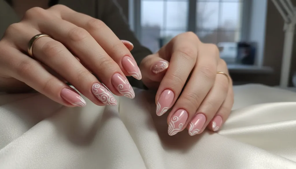 Want something classic but with a little personality? This look combines a soft pink nail polish base with delicate white swirls. The almond shape gives you that elegant, elongated look that photographs so well.