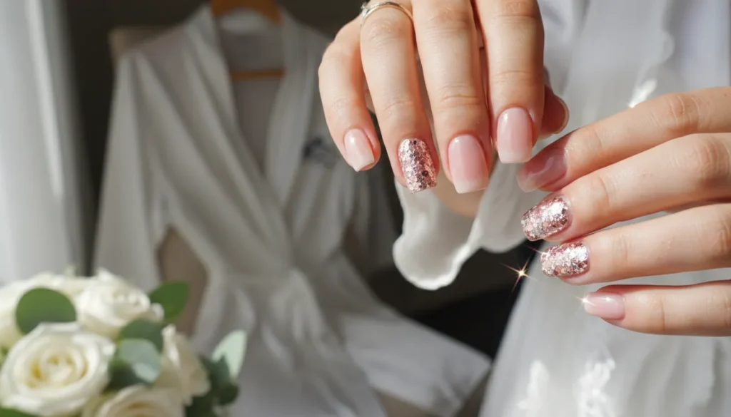 Looking for something fun but still totally bridal? Try a soft pink base with chunky glitter accents. The square shape keeps everything modern and clean, while the glitter makes it feel celebratory.