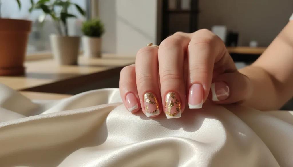 You might be wondering how to add luxury without looking overdone. This is it. A soft pink base with delicate gold leaf tips creates this dreamy, romantic effect.