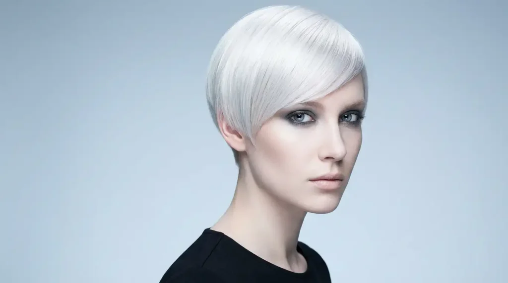 A platinum blonde pixie hairstyle for straight hair is absolutely showstopping. The ultra-light color makes the cut’s sharp lines even more dramatic, creating this high-fashion editorial look.