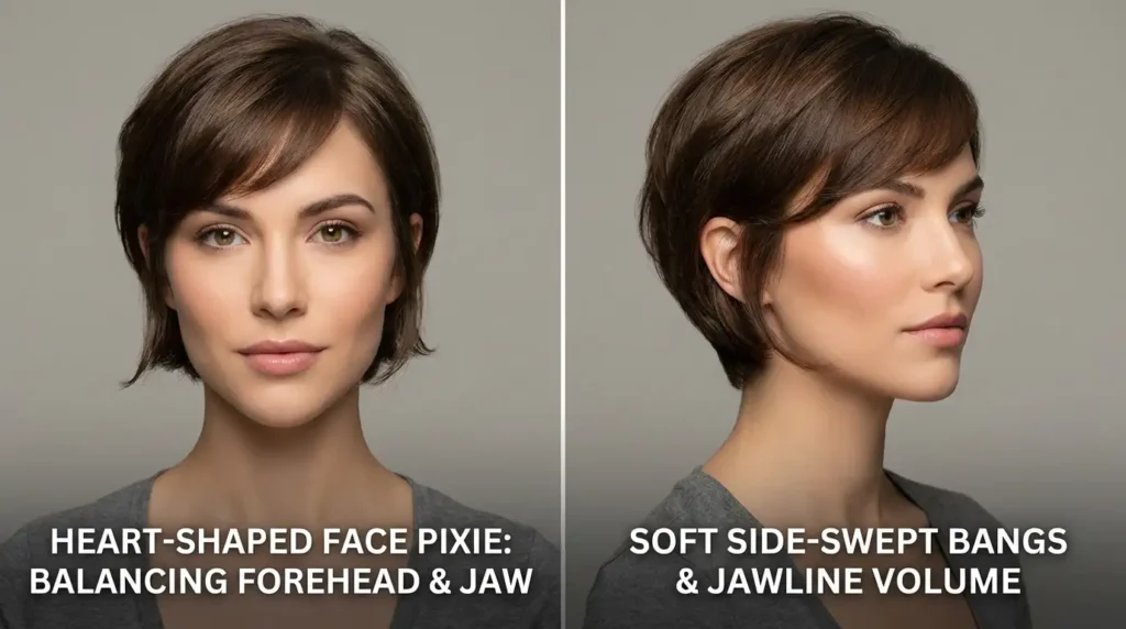 Heart-shaped faces (wider forehead, narrower chin) look gorgeous with pixie hairstyles for straight hair that add width at the jawline. Longer side pieces, outward-flipped ends, or styles with volume at the sides create balance.